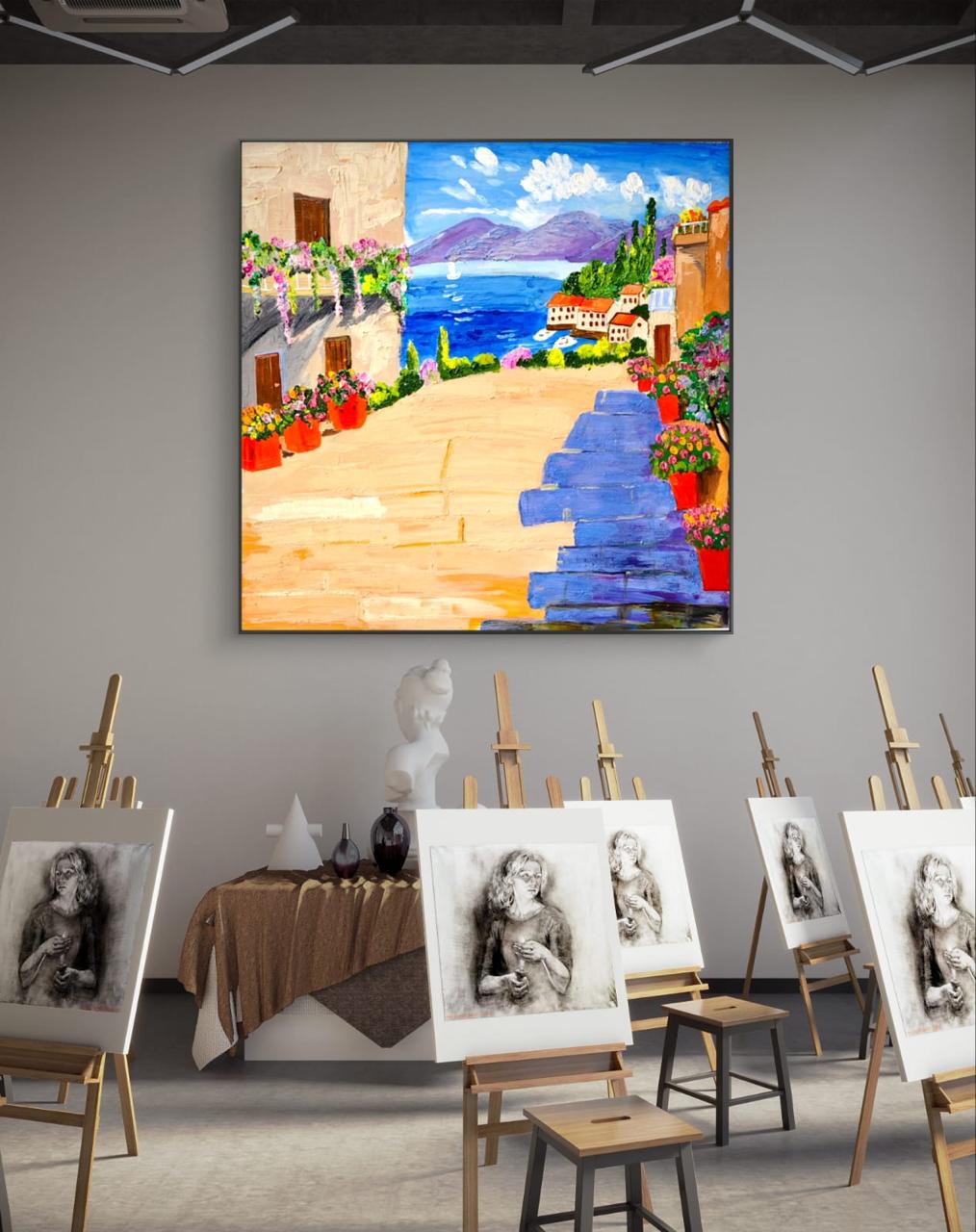 Experience the timeless allure of the Greek isles with this “Santorini Dreamscape” wall art. The painting displays a classic Santorini pathway, lined with blooming flowers and colorful terraces, leading your eyes towards the tranquil blue sea and dramatic mountains under a bright sky. Crafted with artist-grade acrylics on premium canvas, every element— from the vivid water to the lush green and vibrant rooftops—invites the viewer into a Mediterranean daydream. Ready to hang, lightweight, and durable, it’s the perfect artwork to brighten up living rooms, entryways, art studios, or creative spaces.