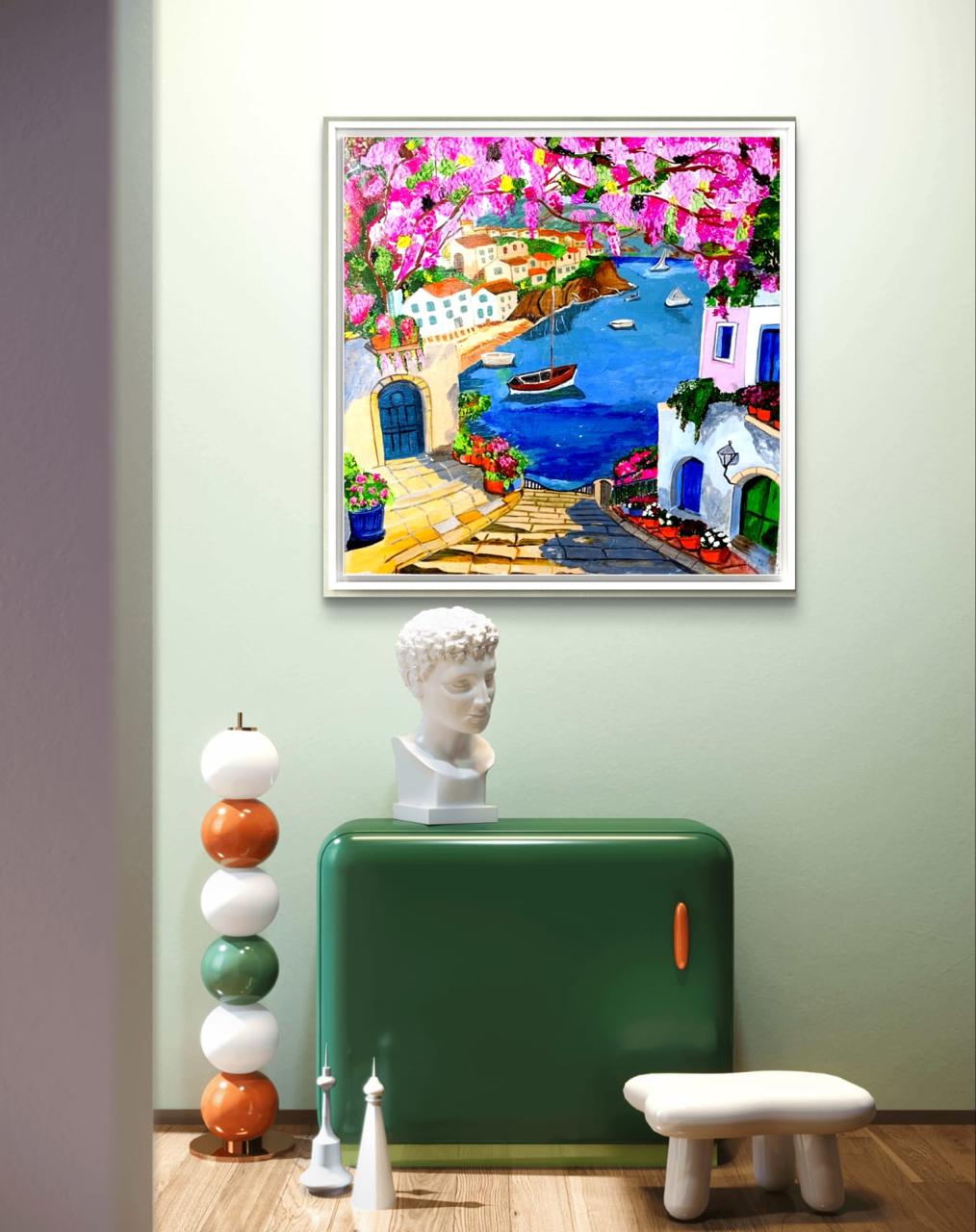 This wall painting features a lively view of Santorini village, embraced by blooming pink trees and overlooking the tranquil blue sea dotted with boats. Created on premium canvas with textured brushwork, every detail—from the stone paths and classic white buildings to the bright waterfront—evokes the spirit of a Greek holiday and invites relaxation. Ready to hang and easy to maintain, this artwork is a celebration of global artistry, making it a great gift or personal indulgence for home décor lovers.