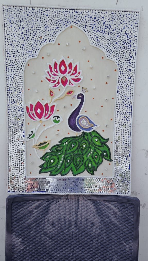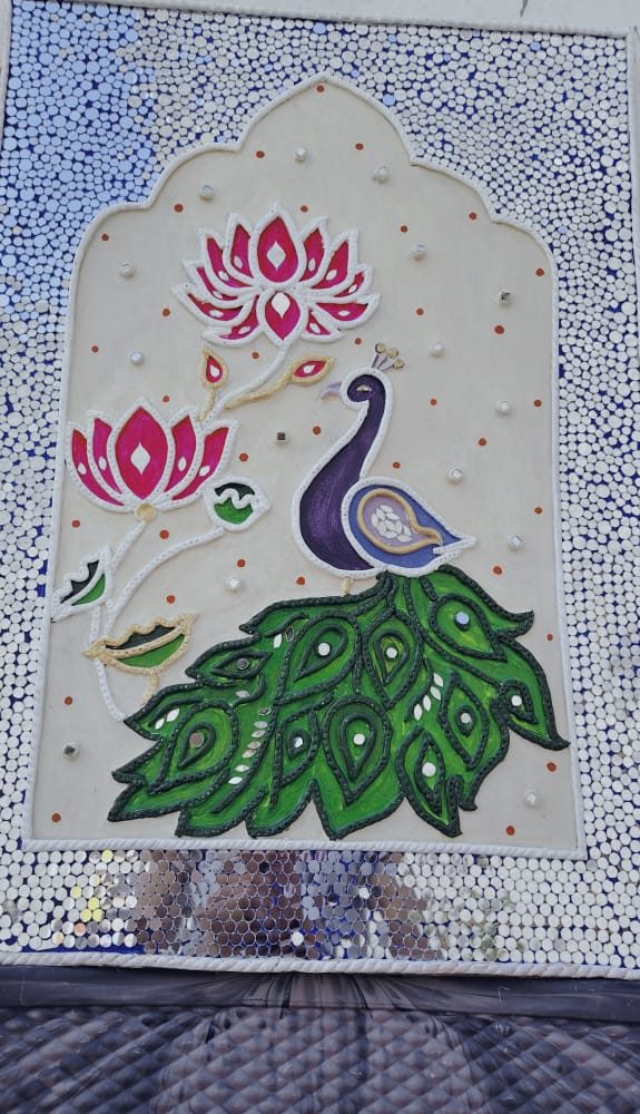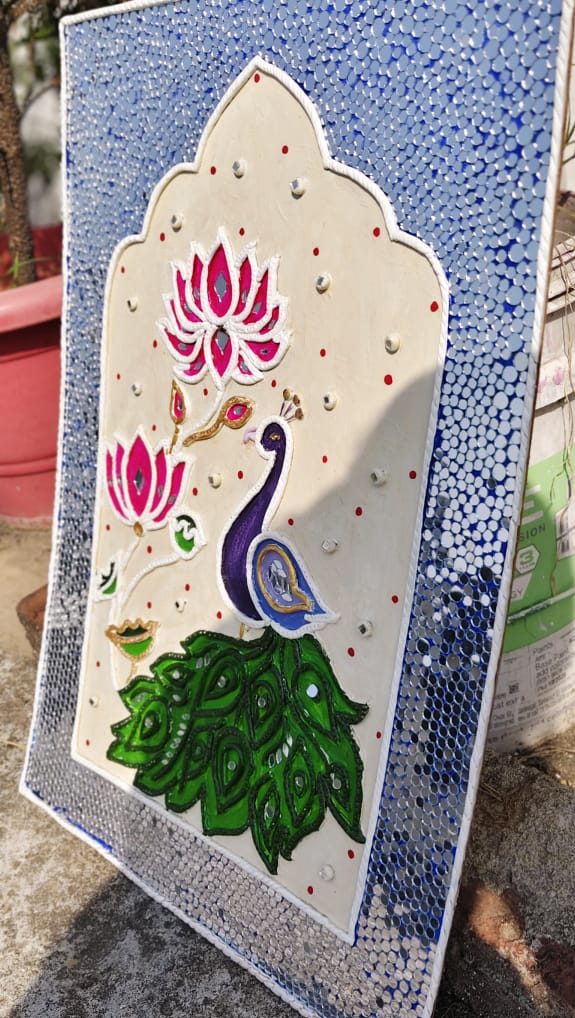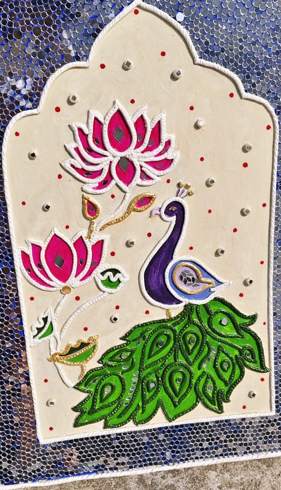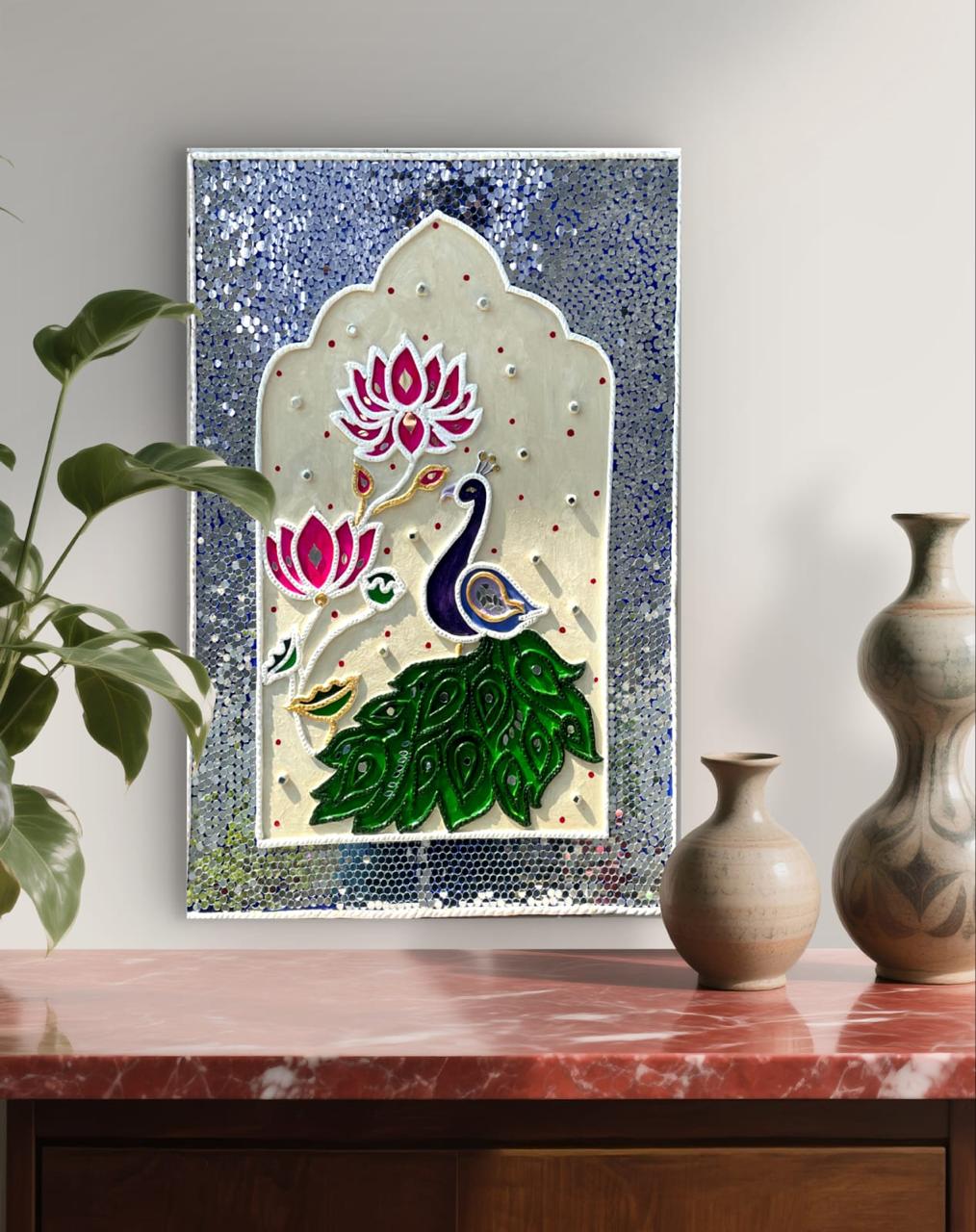 A handcrafted wall decor piece inspired by traditional Lippan art, featuring a majestic peacock (Mayur), vibrant lotus motifs (Kamal), and intricate mirror and clay work. This unique art is made on an MDF base, perfect for bringing divine elegance and an ethnic touch to your living space or as a thoughtful gift